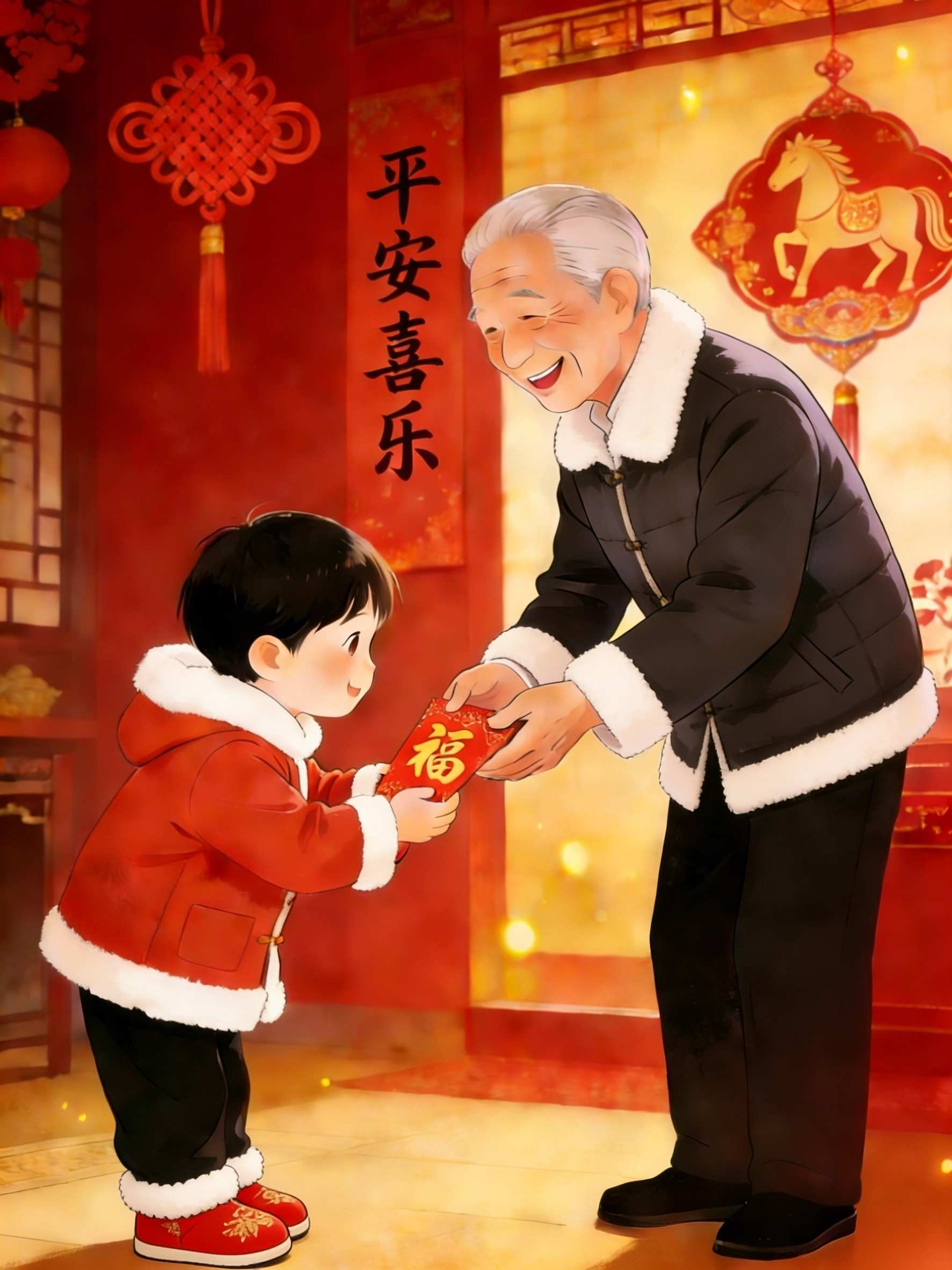 తరువాత, ఒక కుటుంబం తమ పిల్లలకు ఎరుపు కాగితంలో రాగి నాణేలను ఇచ్చింది. అర్ధరాత్రి, రాక్షసుడు“祟” అని లోపలికి వచ్చి పిల్లవాడిని భయపెట్టాలనుకున్నాడు, కానీ ఎర్రటి కాగితంలో ఉన్న రాగి నాణేలు చూసి భయపడి పారిపోయారు, అప్పటి నుండి, రాక్షసుడిని వెంబడించడానికి చాలా మంది ప్రజలు తమ పిల్లలకు ఎరుపు కాగితంలో రాగి నాణేలను ఇవ్వడానికి అనుకరించారు.“祟”.